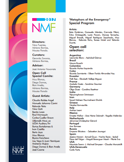 Adriana Barrios Milcho Carlos Cuellar Brown Arnoldo Maal Raul Marroquin Richard Garet Hamlet Lavastida Anupong Charoenmitr Wanbli Gamache Kamila Wolszczak UOM Auditory Art Mirjamsvideos Tusia Dabrowska Catherine Biocca Heidi Horsturz Vijayaraghavan Srinivasan Youjin Moon RaumZeitPiraten Ben Neufeld Amitai Arnen Jeremy Stewart Eleonora Roaro Sonia Laura Armaniaco Carla Forte Katarzyna Parejko Matthew Schoen Christopher Chiu Daniel Nicolae Djamo Daniel Wechsler Video Damian Lintell Smith Johanna Reich Vanja Mervic Adam Castle Video Sandrine Deumier Muu Blanco Amereida World Beat